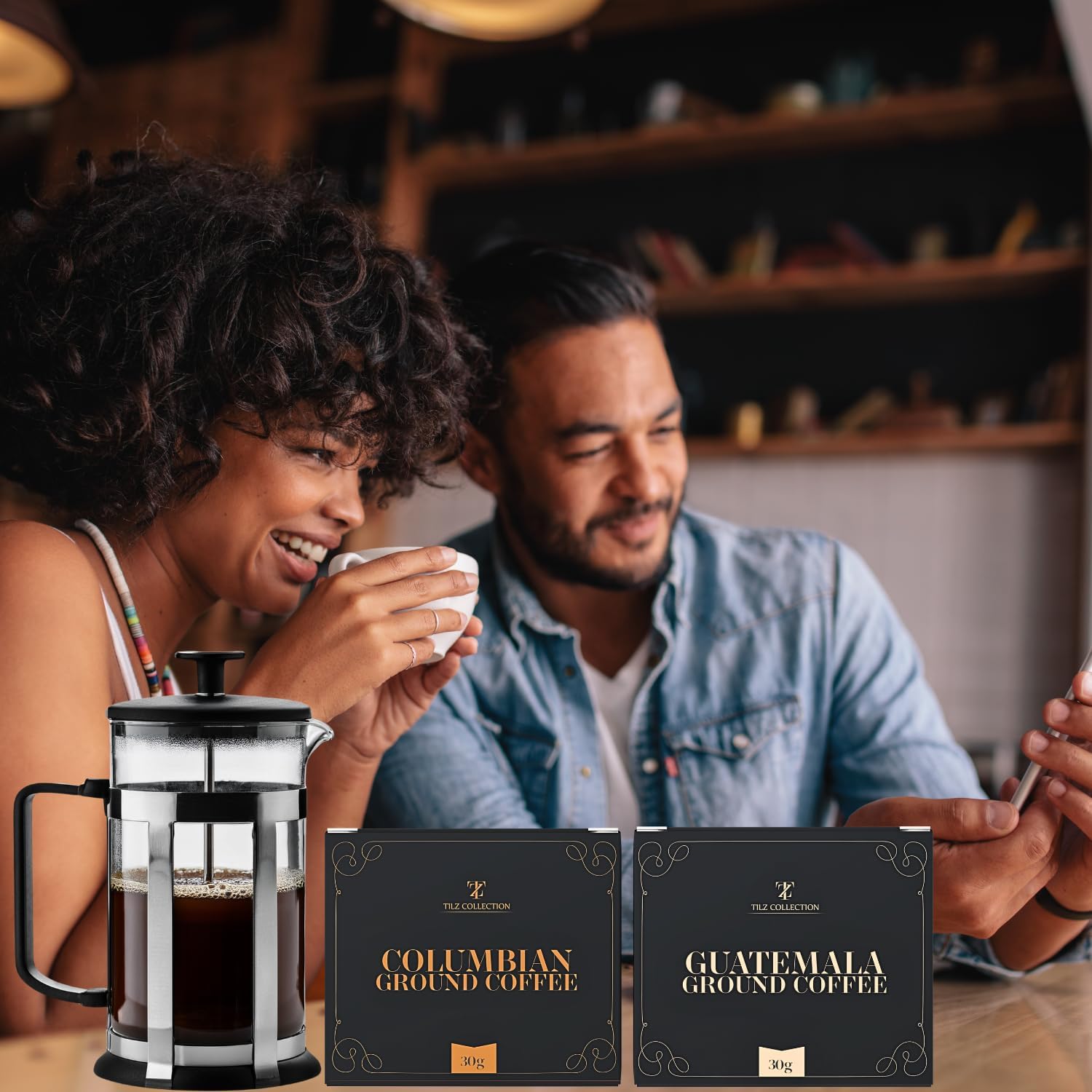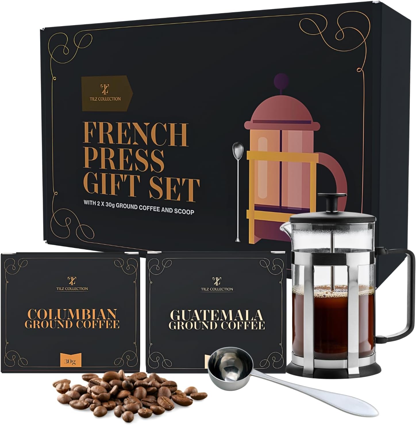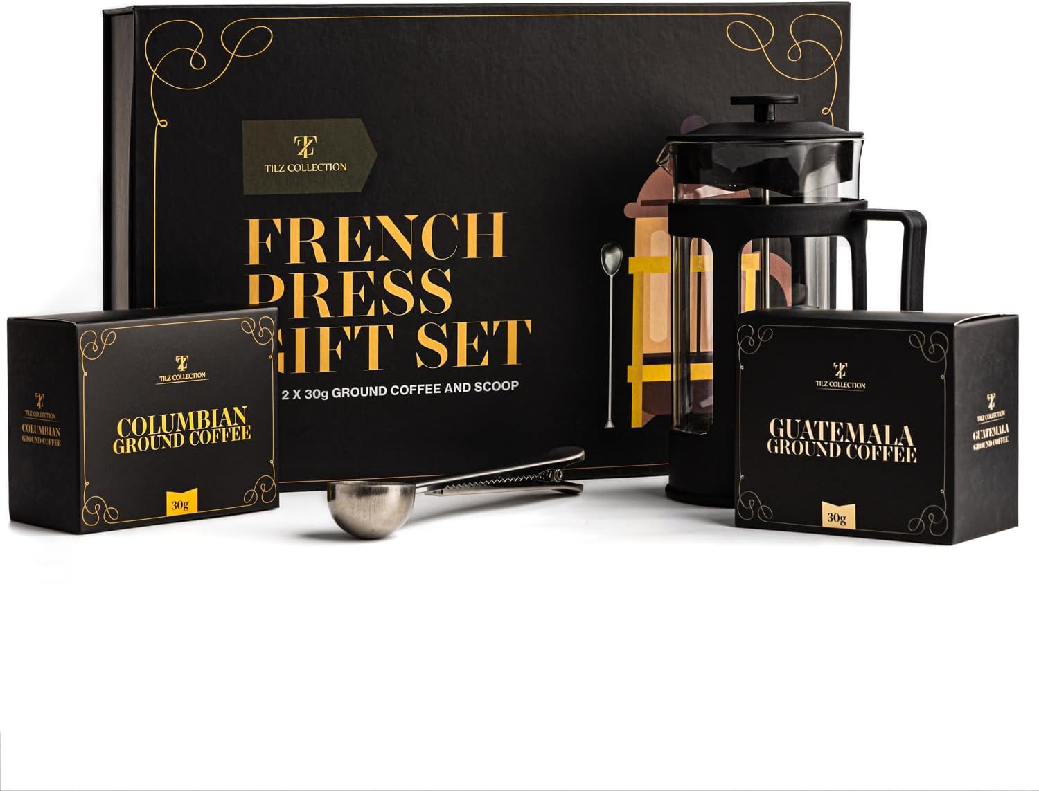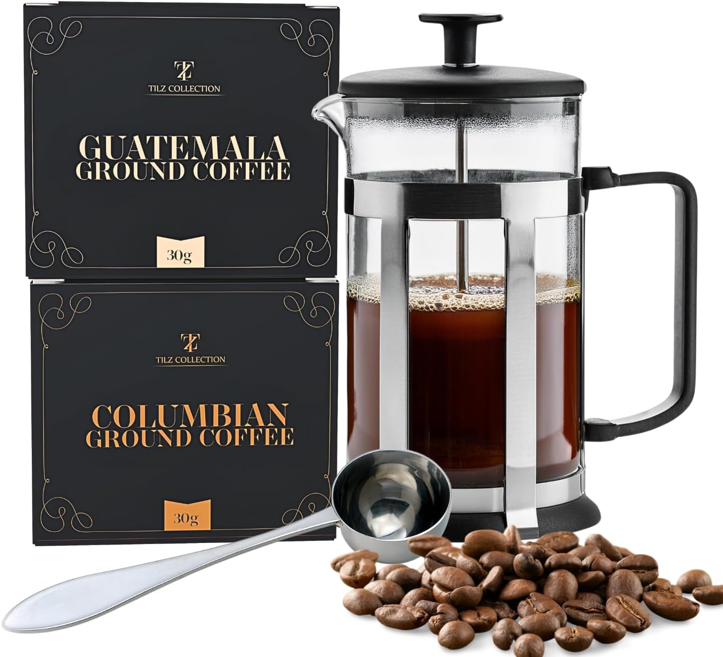 Elevate your coffee experience with our French Press Gift Set. This beautifully packaged set includes a premium cafetiere, a coffee spoon, and two exceptional ground coffee selections: Guatemalan and Colombian. Whether you’re gifting it or treating yourself, this set brings the taste of world-class coffee right into your home.
