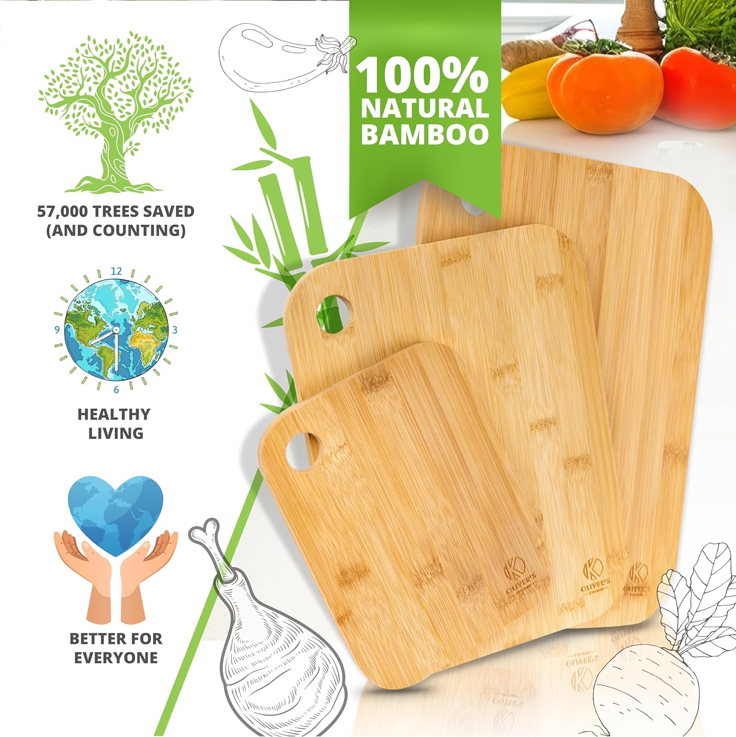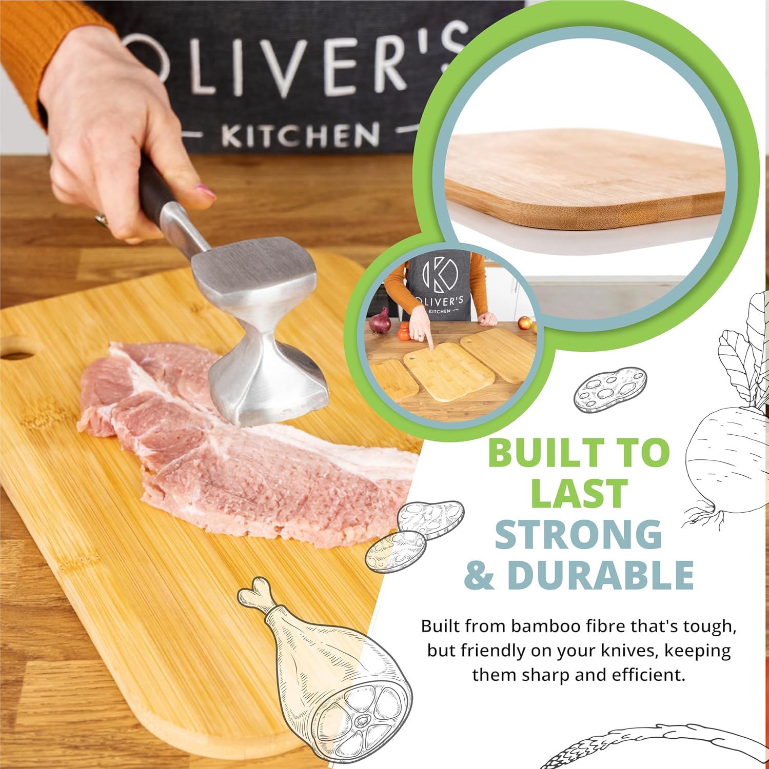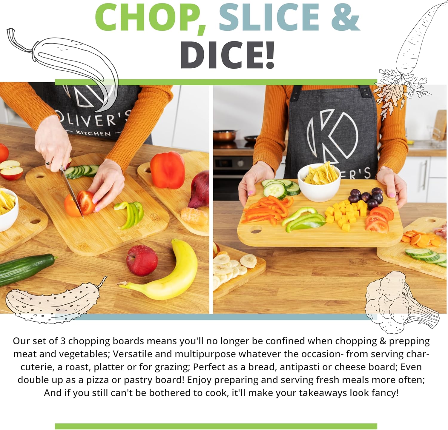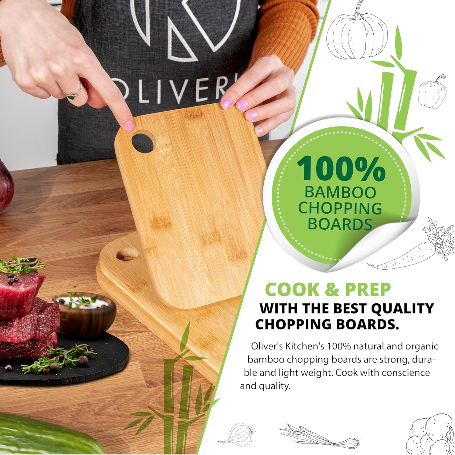 💎 PREMIUM QUALITY, 100% NATURAL ORGANIC BAMBOO CHOPPING BOARDS: Super hard wearing 100% natural bamboo wood that is built to last. Oliver’s Kitchen’s Chopping Boards are strong and durable, if they were more strong, durable and handsome we’d be writing romance fiction about them